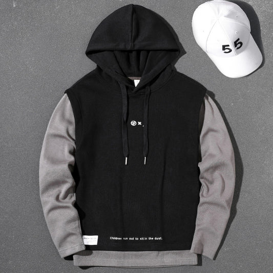 Handsome heavyweight gray fake two-piece 2023 spring, autumn and winter hooded large size top loose pullover long-sleeved sweatshirt for men