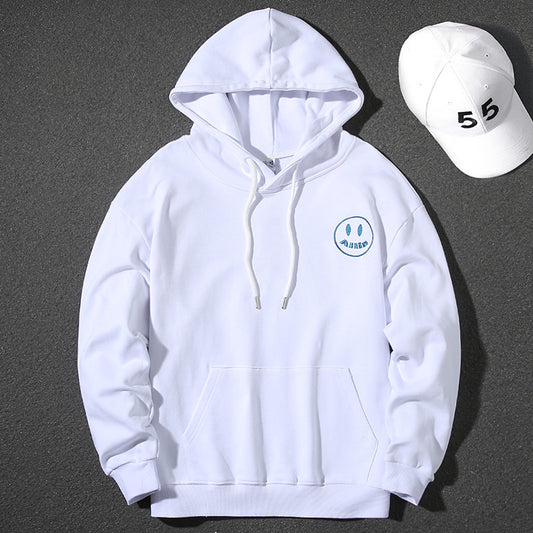 Handsome pure cotton hooded sweatshirt for men, autumn and winter Korean style smiley face letter print loose long-sleeved pullover casual top